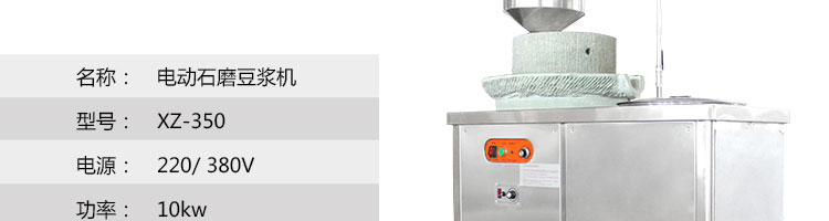名稱XZ-350型電動石磨豆?jié){機 電源220/380V 功率10kw 產(chǎn)量30kg/h 尺寸1000*550*1100mm 重量 規(guī)格 其他