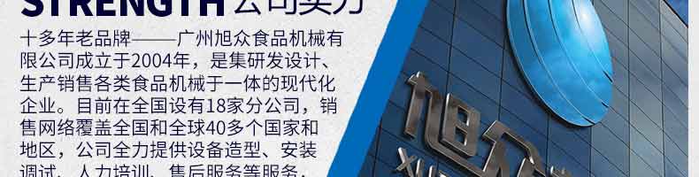 廣州旭眾食品機(jī)械有限公司是一家集科研開發(fā),生產(chǎn)設(shè)計,營銷服務(wù)為一體的現(xiàn)代化生產(chǎn)企業(yè)?,F(xiàn)代化生產(chǎn)車間,精湛制造技術(shù),所產(chǎn)機(jī)械歷經(jīng)市場重重考驗,不斷贏得海內(nèi)外客戶的贊譽。